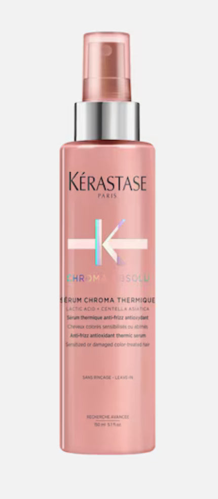 Kérastase Chroma Absolu Sérum Chroma Thermique is een universeel anti-pluis, antioxidant thermisch serum voor elk type gevoelig of beschadigd gekleurd haar. Een hydraterende, lichtgewichte, melkachtige formule die gekleurd haar verzorgt maar ook op intensieve wijze het haar beschermt tegen diverse schadelijke invloeden van buitenaf: UV-veroorzaakte schade, vochtigheid, hitte en oxidatieve stress.